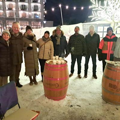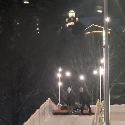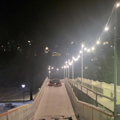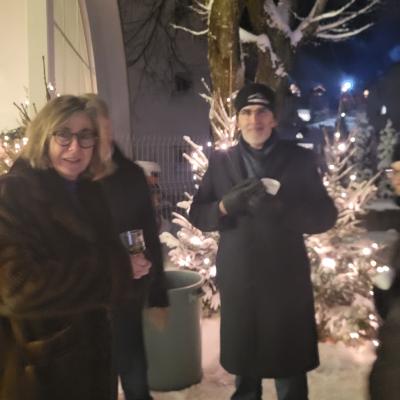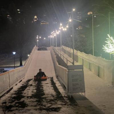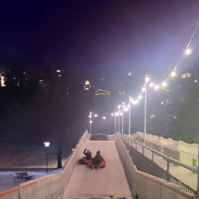 Eine märchenhafte winterliche Stimmung erwartete uns, als wir um 18.00 im Kurpark eintrafen. Eine Feuerschale mit einem gemütlich knisternden Feuer wärmte uns während die Temperatur um die -15 Grad betrug. Jaswinder Singh, der die kleine Buvette an der Eisrutsche führt, hat uns ein paar Fleisch-und Käseplättli vorbereitet und wir genossen den heissen Glühwein und die schon bald tiefgekühlten Schinken- und Salamitranchen. Viel gelacht haben wir beim herunterrutschen auf der Eisbahn mit den vorhandenen Gummireifen. Bestimmt lachen hier auch die Kinder beim Rutschen und erfüllen den Kurpark mit Leben. Ein zauberhafter Ort an dem wir uns für das neue Jahr alles Gute wünschten und ein kurzes Beisammensein genossen. Es war wunderbar.